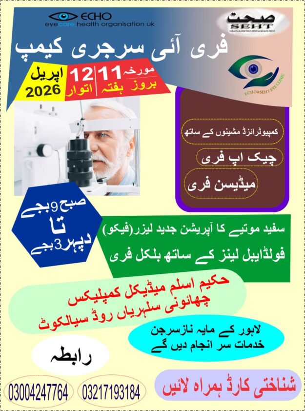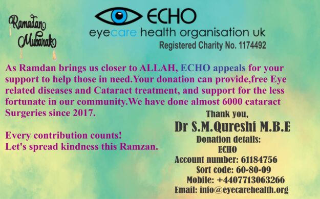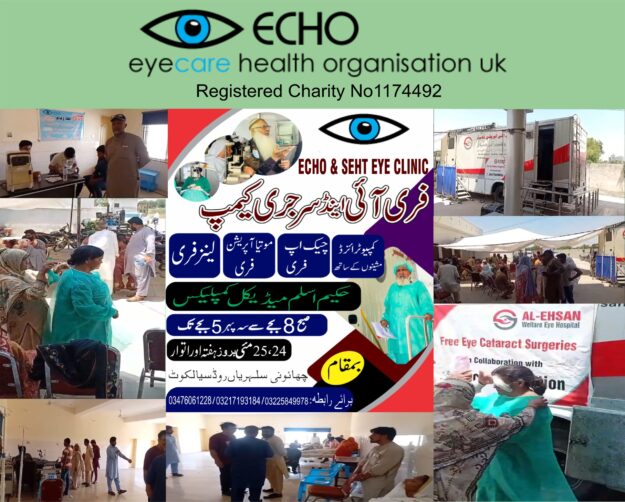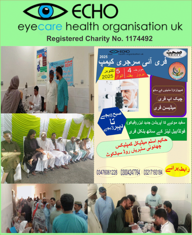Providing free eye check-ups and surgical treatments for those in need. Join us at the Mian Hakim Aslam Medical Complex to receive professional care and restore your vision at no cost. Please sponsor a cataract surgery for £35. Donation details: ECHO Account number: 61184756 Sort code: 60-80-09 Mobile: +4407713063266 Email: info@eyecarehealth.org Website: www.eyecarehealth.org