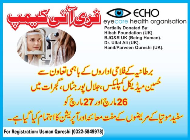 LATEST NEWS for October 2022: Cataract removal eye camp in Pakistan ECHO is helping poor people by providing free cataract surgery in the eye camps of Pakistan. 300 free cataract operations on 15th and 16th and then 18th and 19th at Sialkot and Seri Alamgir Pakistan. Your donation will change the lives of many poor…